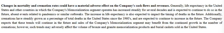 SCI had to partake in a $209mm federal class-action lawsuit settlement after it allegedly deceived 87,000 Florida customers who bought prepaid cremation plans. There was another SCI related case where there was a $23mm settlement after California residents were confused over a “standard plan” that marked up merchandise and had lower than full refund rates, even before services were provided.