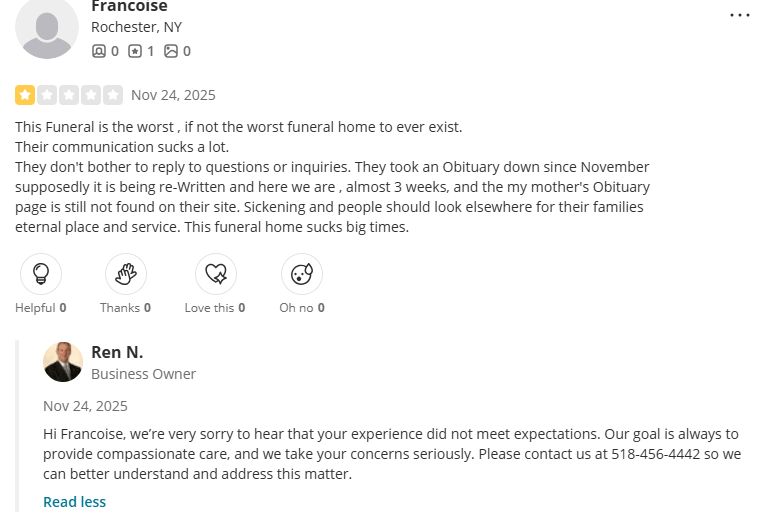 It’s hard to really differentiate whether some of the independent players are truly in it for the money or not, but one family owned company I noticed was Newcomer Funeral Service Group which has 50+ locations and is a fifth-generation funeral service provider. It is encouraging to see their CEO reply directly to a negative Yelp review though.