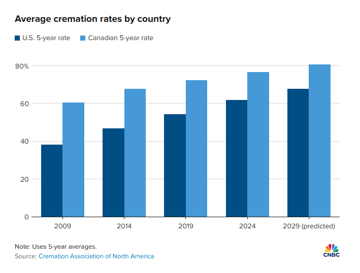 There’s also an “ESG” element, where younger generations think about more environmentally friendly burial options, which basically means increased cremation.